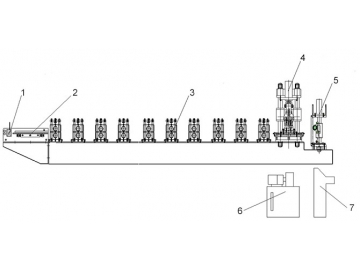 Carregamento → Desbobinamento e alimentação → Ajustamento e guia → Prrfilagem → Perfuração após prensagem → Corte → Mesa de operação final